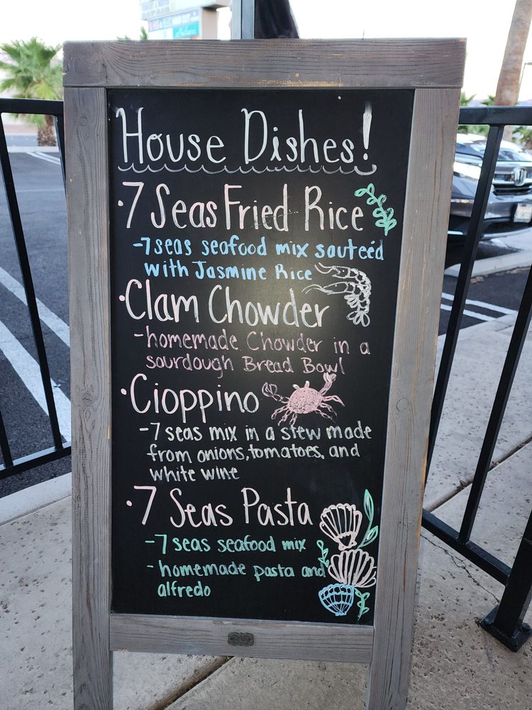 Crab legs, clams, mussels, shrimp, scallops, Mahi-Mahi, calamari, potatoes, tomatoes, bell peppers, onions, and cilantro mixed into our house seafood broth.